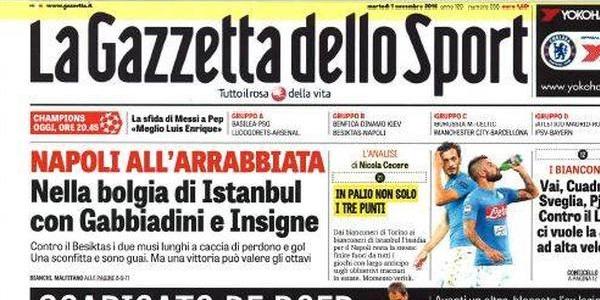 Sulle prime pagine dei quotidiani sportivi che tra qualche ora saranno disponibili in edicola, si da tanto spazio all’Inter e il possibile esonero di De Boer. Non mancano riferimenti anche sul Napoli impegnato in Champions League con il Besiktas.
