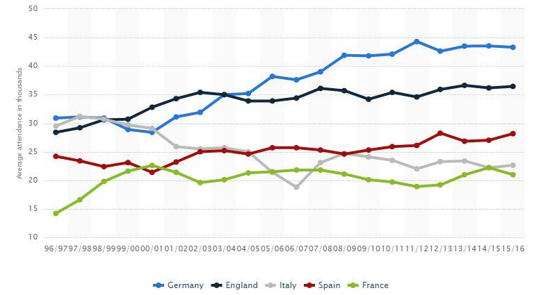 In generale sebbene nell’intervento radiofonico l’argomento sia stato trattato con leggera superficialità anche a causa del breve tempo a disposizione, le parole del presidente sono assolutamente veritiere, la media spettatori della Serie A è poco superiore ai 22.640 spettatori per partita stando ai dati relativi all’ultima stagione, numeri in calo cronico se rapportati dall’ultimo ventennio. Se infatti nel 1996 la Average per Game Attendance (media spettatori per incontro) era leggermente inferiore alle 30.000 unità (v. schema allegato), col passare del tempo vi è un calo costante che giustifica pienamente le parole di De Laurentiis. Anche quando confronta i dati italiani con quelli tedeschi e inglesi non dice il falso anzi, Bundesliga e Premier League hanno medie mostruose, gli unici club che non superano i 30.000 spettatori per match sono quelli che hanno stadi con capacità inferiori e non certo perché abbiano difficoltà a riempirli.