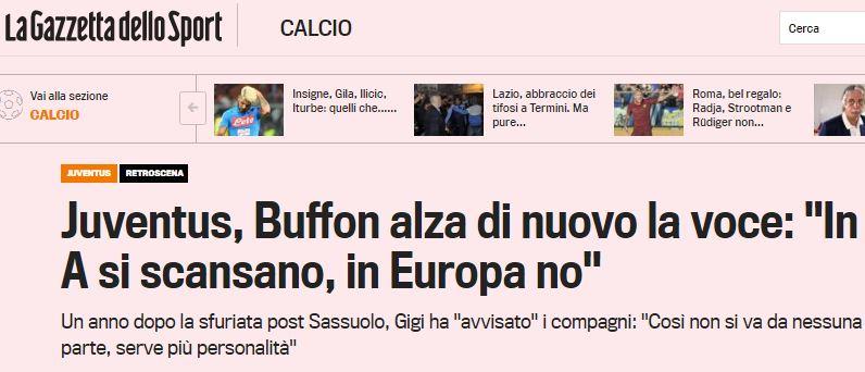 La Gazzetta dello Sport in data odierna ha pubblicato un articolo che può definirsi una vera e propria bomba: secondo fonti che hanno preferito lasciare anonime, il portiere e capitano della Juventus Gianluigi Buffon, a seguito della vittoria contro il Napoli, avrebbe pronunciato queste parole nello spogliatoio preoccupato per le prestazioni mediocri della squadra: “Ragazzi, così non si va da nessuna parte. In Italia vinciamo perché gli altri si scansano, ma in Europa non succede e non succederà. In Italia le uniche due squadre che non si sono scansate ci hanno battuto. Serve più personalità, più grinta, più voglia di aiutarsi, altrimenti ci complicheremo la vita in campionato e soffriremo in Champions“. La Juventus ha proceduto ad una smentita di rito ma la Gazzetta dello Sport non ci sta e ha risposto, proprio questo pomeriggio, ribadendo che l’articolo è assolutamente veritiero e continua a tutelare la sua fonte e le sue ragioni.