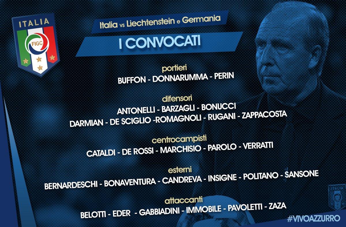 Giampiero Ventura ha convocato 28 giocatori per le sfide contro Liechtstein e Germania, in programma rispettivamente il 12 ed il 15 novembre. Ritorna Lorenzo Insigne, confermato Manolo Gabbiadini. Rientrano anche Marchisio, Zaza e Zappacosta. Novità Cataldi a centrocampo e Politano in attacco.
