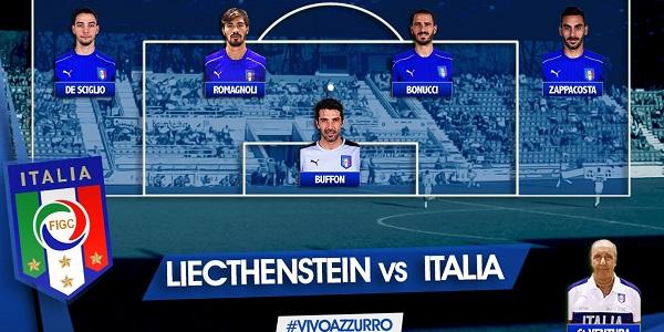 Arrivano le formazioni ufficiali di Liechtenstein-Italia, gara valida per le qualificazioni al mondiale del 2018 in Russia. Il CT Ventura lancia dall’inizio il modulo 4-2-4, ma lascia in panchina Insigne. Gli esterni saranno Candreva e Bonaventura, in avanti ci si affida alla coppia Belotti-Immobile.
