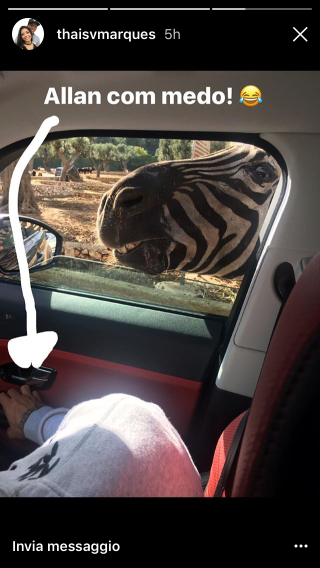 Giornata di relax per gli azzurri, in attesa di riprendere gli allenamenti a Castel Volturno in vista di Udinese-Napoli, che si giocherà sabato diciotto. Il brasiliano Allan ha approfittato della domenica libera per recarsi, in compagnia della famiglia, allo Zoo-safari di Fasano, in Puglia, come testimoniano gli scatti della bellissima compagna Thais. In particolare, Allan ha avuto un simpatico “siparietto” con una zebra, che ha spaventato il centrocampista azzurro, la cui reazione è tutta da ridere (SCORRI IN ALTO LE FOTO).