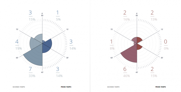 GOL FATTI IN TOTALE: 1 nei primi 15′; 5 tra 15′ e 30′; 5 tra 30′ e 45′; 10 tra 45′ e 60′, 5 tra 60′ e 75′, 4 negli ultimi 15′. Le reti realizzate nel primo tempo sono 11, dopo l’intervallo bene 19 su 30, di cui 15 (il 50%) nella prima mezzora del secondo tempo.
