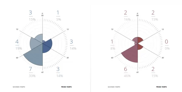 Due competizioni diverse, numeri che rispecchiano situazioni simili. Il Napoli di Sarri non parte mai fortissimo, lo dimostra la sola rete siglata nel primo quarto d’ora, dà il meglio di sé in fase realizzativa ad inizio ripresa fino alla metà del secondo tempo, ma in questo lasso di tempo tende anche a sbilanciarsi e commettere più errori difensivi (8 gol subiti su 20). E – in conclusione -verso la fine dei match perde spesso la concentrazione: negli ultimi 15′ il 25% delle reti incassate.
