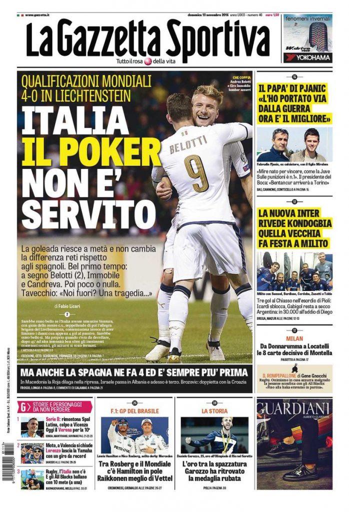 La vittoria dell’Italia per 4-0 contro il Liechtenstein ha, come era prevedibile, monopolizzato le prime pagine dei quotidiani sportivi che tra poche ore troveremo in edicola.