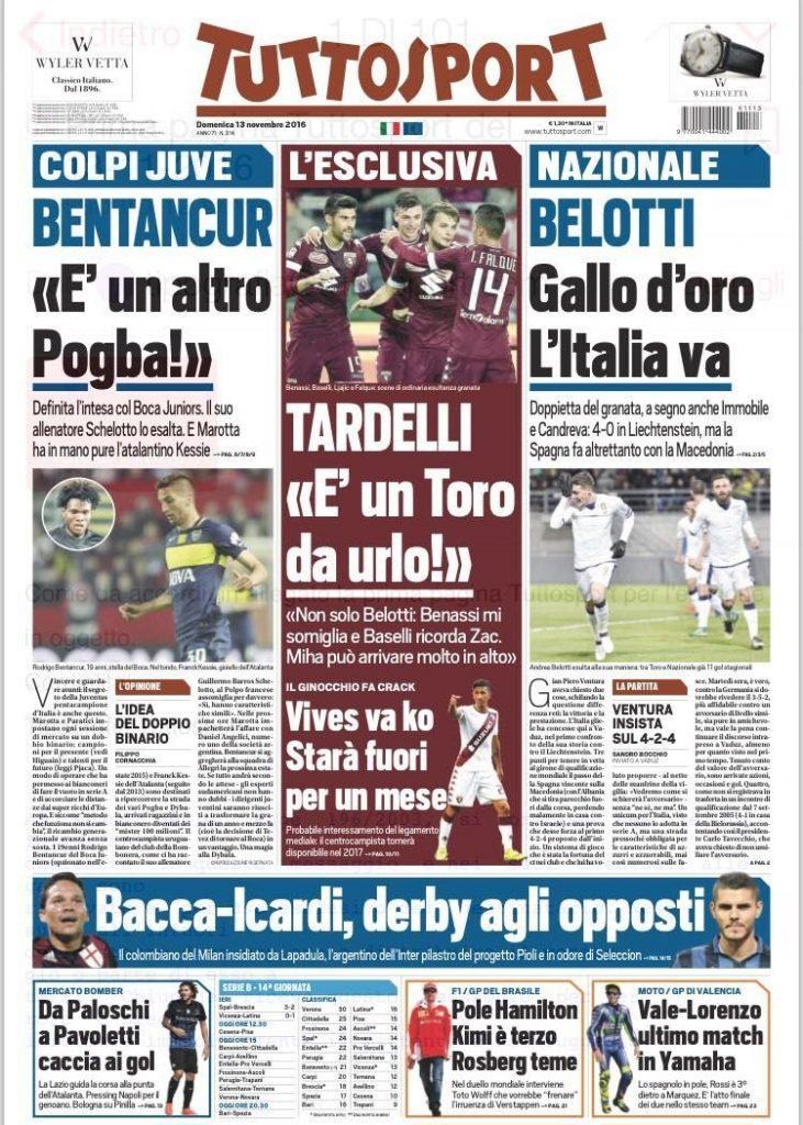 La prima pagina di Tuttosport infine si divide tra la Nazionale, “Belotti, gallo d’oro“, i colpi della Juve, “Bentancur: è un altro Pogba!“, e le parole di Tardelli rilasciate proprio al quotidiano torinese. In taglio basso spazio al mercato con il Napoli in pressing su Pavoletti.