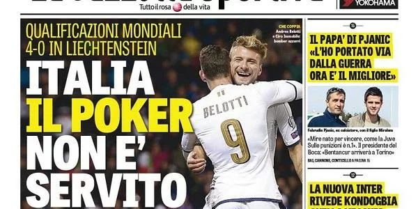 La vittoria dell’Italia per 4-0 contro il Liechtenstein ha, come era prevedibile, monopolizzato le prime pagine dei quotidiani sportivi che tra poche ore troveremo in edicola.