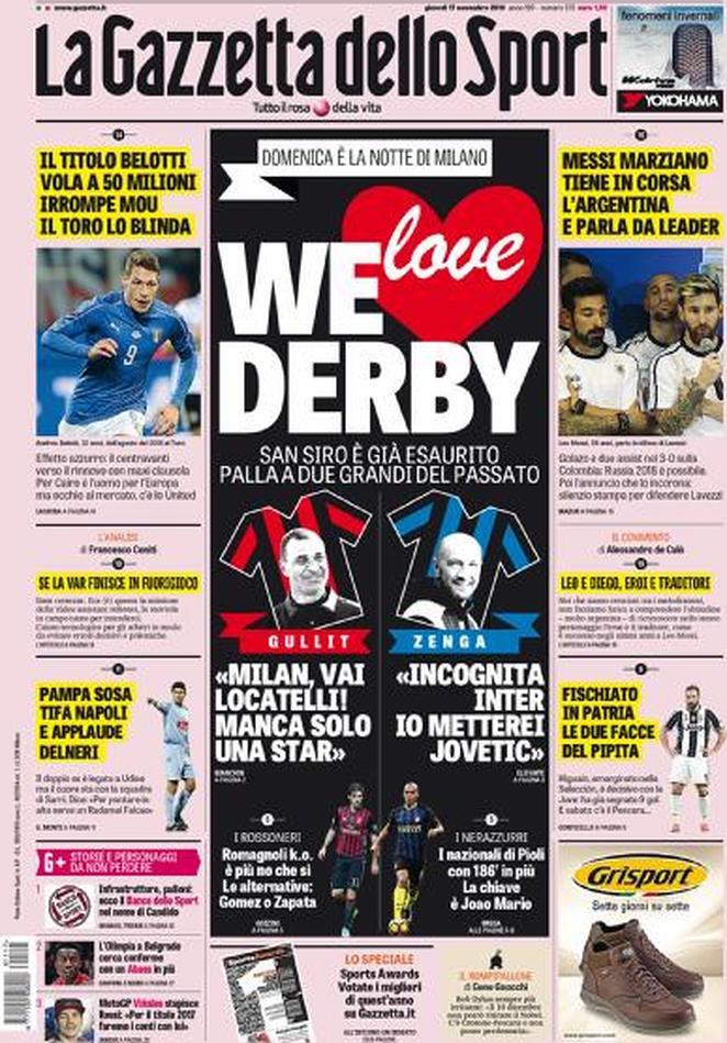 Sulla Gazzetta dello Sport il titolo in prima pagina è: “We love derby“, con interviste a Gullit e Walter Zenga.