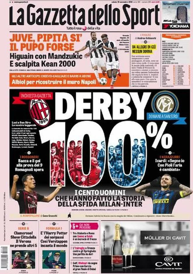 Sono online le prime pagine dei quotidiani sportivi italiani. Ampio spazio, per la Gazzetta dello Sport, al Derby di Milano, che vedrà contrapposte Milan ed Inter: una partita storica per l’intero mondo del calcio. Ampio spazio anche alla Juventus e a Gonzalo Higuain, l’uomo della fuga e colui che dovrà far tacere gli scettici che, in questa settimana con la Nazionale, l’hanno messo in discussione: è questo il titolo di Tuttosport. Il Corriere dello Sport (che propone anche una intervista a Sinisa Mihajlovic) dedica un focus al Napoli, impegnato ad Udine questa sera alle diciotto: pensando a Keita Balde Diao, uno degli obiettivi della dirigenza azzurra.