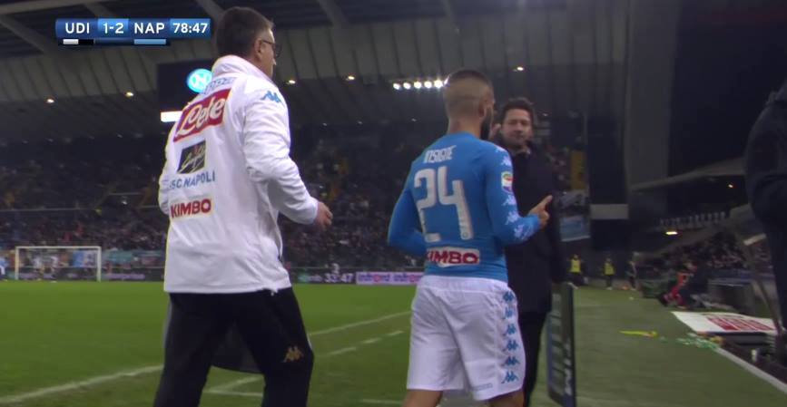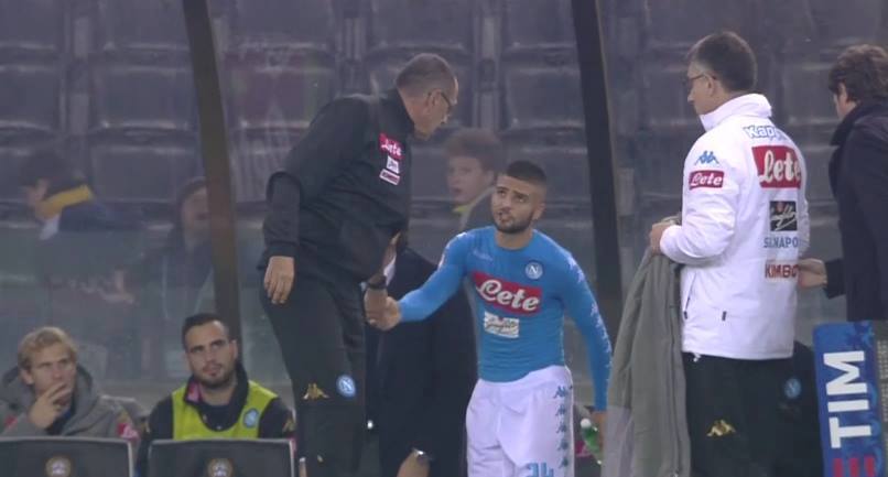 Al minuto ottanta è stato poi richiamato in panchina da Maurizio Sarri. Standing ovation per lui, uscito peraltro da capitano, avendo ricevuto la fascia da Marek Hamsik. Nel momento del ritorno in panchina, Insigne ha stretto la mano al team manager De Matteis e a Maurizio Sarri, al quale poi ha chiesto se potesse andare a farsi la doccia, avendo avuto la febbre.