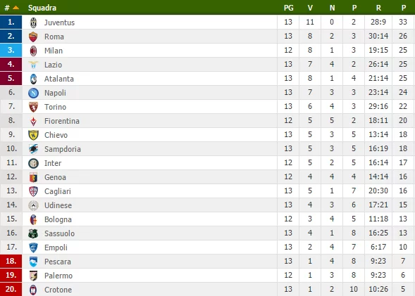 La tredicesima giornata di Serie A ormai prossima agli archivi. Le partite delle quindici si sono appena concluse, in attesa del Derby di Milano che si giocherà alle venti e quarantacinque.