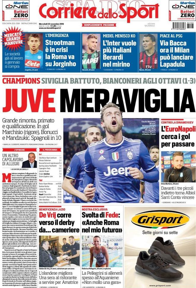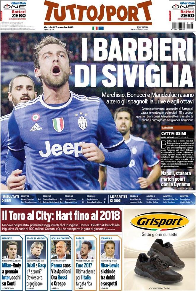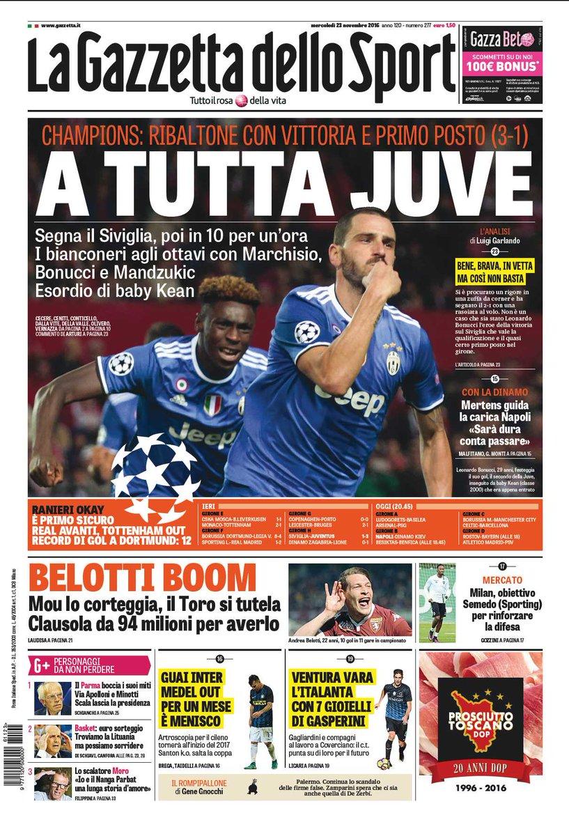 Si concentrano molto sulla Champions le prime pagine sportive dei quotidiani italiani di oggi, con la Juventus vittoriosa a Siviglia, in attesa della sfida tra Napoli e Dynamo Kiev.
