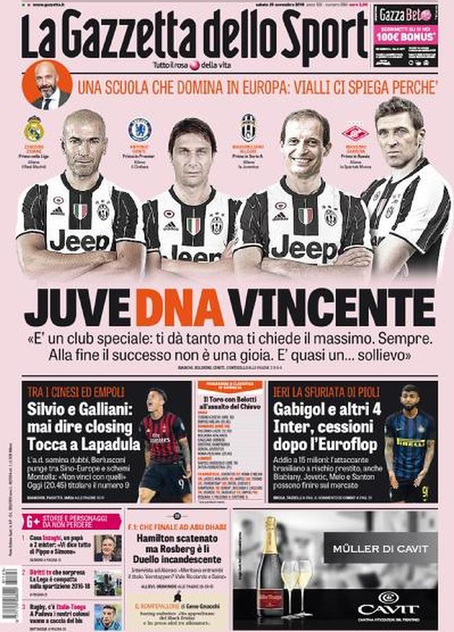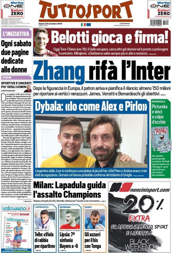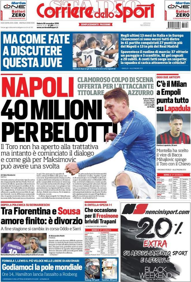 Sono online le prime pagine dei maggiori quotidiani sportivi oggi in edicola. Si comincia con la notizia bomba del Corriere dello Sport: il Napoli sarebbe pronto ad una offerta da quaranta milioni per Belotti, l’uomo del momento. Affare difficile, se non impossibile, considerando anche il fatto che il presidente Cairo non è osso facile. In controtendenza Tuttosport che, oltre a dedicare spazio all’Inter e alla situazione societaria in casa nerazzurra, parla proprio del “Gallo”, pronto al rinnovo con clausola monstre valida solo per l’estero: Belotti, peraltro, sarà in campo nella sfida tra Torino e Chievo delle diciotto. Poi spazio anche a Paulo Dybala. Infine la Gazzetta dello Sport, in prima pagina, con una intervista a Vialli che spiega lo stile Juve, il DNA vincente. Focus anche sulle due squadre di Milano: il Milan, atteso dal closing, e l’Inter, chiamato al cambio di marcia dopo “l’Euroflop”.