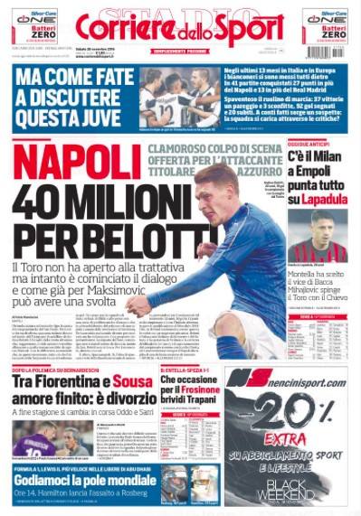 Sono online le prime pagine dei maggiori quotidiani sportivi oggi in edicola. Si comincia con la notizia bomba del Corriere dello Sport: il Napoli sarebbe pronto ad una offerta da quaranta milioni per Belotti, l’uomo del momento. Affare difficile, se non impossibile, considerando anche il fatto che il presidente Cairo non è osso facile. In controtendenza Tuttosport che, oltre a dedicare spazio all’Inter e alla situazione societaria in casa nerazzurra, parla proprio del “Gallo”, pronto al rinnovo con clausola monstre valida solo per l’estero: Belotti, peraltro, sarà in campo nella sfida tra Torino e Chievo delle diciotto. Poi spazio anche a Paulo Dybala. Infine la Gazzetta dello Sport, in prima pagina, con una intervista a Vialli che spiega lo stile Juve, il DNA vincente. Focus anche sulle due squadre di Milano: il Milan, atteso dal closing, e l’Inter, chiamato al cambio di marcia dopo “l’Euroflop”.