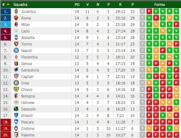 Si sono appena chiuse le gare della domenica della quattordicesima giornata di Serie A, che si concluderà domani sera con i posticipi Napoli-Sassuolo e Inter-Fiorentina, previsti rispettivamente alle 19.00 e alle 21.00.