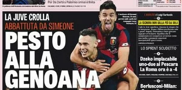 Le prime pagine sportive di oggi si concentrano soprattutto sui temi del campionato con la sconfitta della Juventus sul campo del Genoa, e la vittoria a fatica della Roma sul Pescara (CLICCA QUI PER TUTTI I RISULTATI E LA CLASSIFICA).