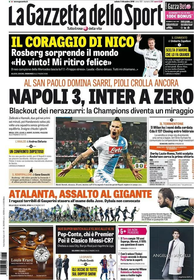 Sono online le prime pagine dei quotidiani sportivi oggi in edicola. Grande attenzione al Napoli che disintegra l’Inter per 3-0 nell’anticipo del San Paolo. È così che apre la Gazzetta dello Sport, che poi fa il punto anche sull’Inter, un fantasma al San Paolo ed ormai lontana dalla zona Champions nonostante un campionato ancora lungo e pieno di insidie per tutte le concorrenti. Il Corriere dello Sport invece elogia la grande prova di carattere degli uomini di Sarri, che, complice un avvio micidiale, hanno subito rimesso le cose a posto e annichilito l’evanescente troupe di Stefano Pioli. Chiusura, infine, con TuttoSport che dedica attenzione alla furia del Pipita Higuain, a caccia di gol per “cancellare veleni e polemiche”. Poi spazio anche agli azzurri: “Canta Napoli – si legge – ma l’Inter dov’è?”. (SCORRI IN ALTO LA GALLERY).