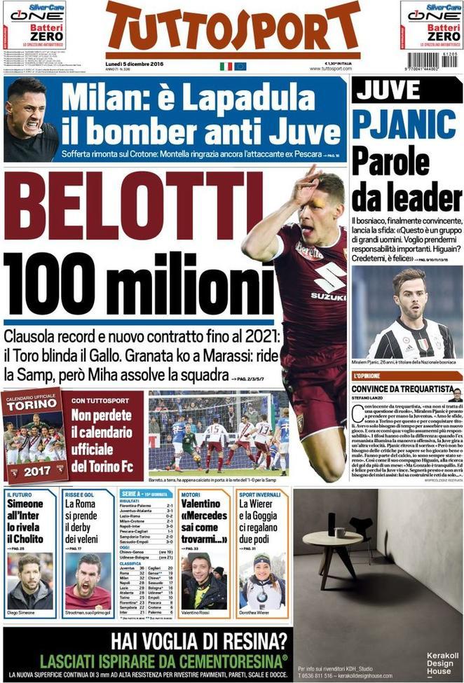 Non mancano anche riferimenti al mercato con il rinnovo del contratto di Belotti con il Torino. Rinnovo che prevede una maxi clausola da ben 100 milioni di euro (SCOPRI I DETTAGLI). Queste le prime pagine sportive di Gazzetta dello Sport, Corriere dello Sport e Tuttosport.