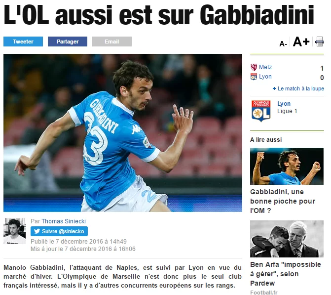 Al momento, però, sarebbe solo voci, una vera e propria trattativa tra i due club non è mai partita. Difficile però ipotizzare Gabbiadini proprio con la maglia del Lione, visti i rapporti non propriamente idilliaci tra De Laurentiis e Aulas, specie dopo la mancata conclusione delle trattative Gonalons prima e Tolisso poi.