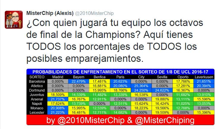 A spaventare, però, sono i possibili incroci degli azzurri. Secondo le statistiche del noto analista spagnolo Alexis Martin-Tamayo, in arte Misterchip, i partenopei dovranno temere Real Madrid, Siviglia e Manchester City su tutti. I blancos con il 17 % sono gli avversari più probabili.