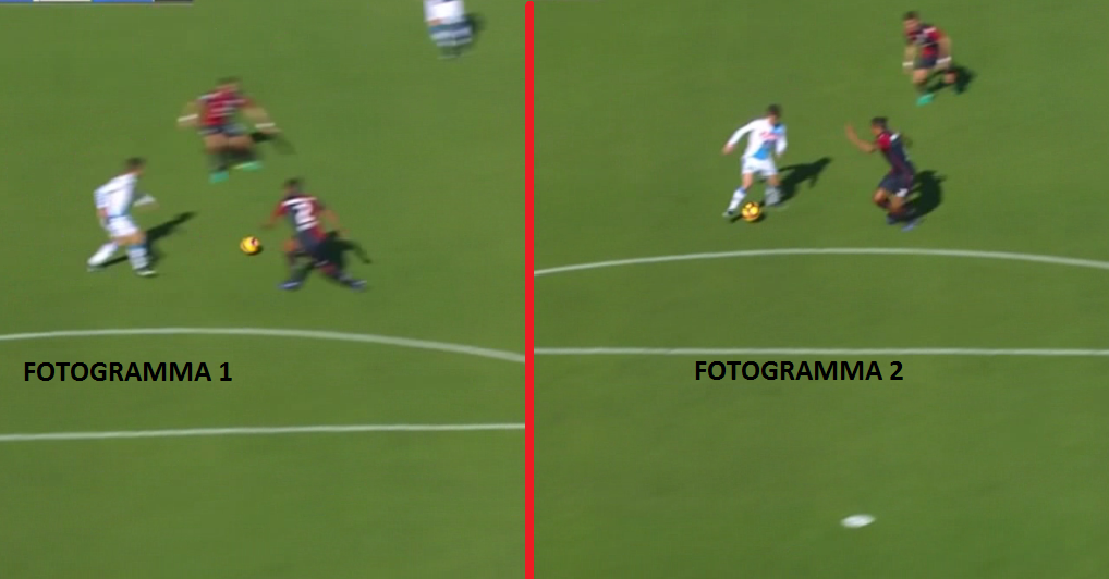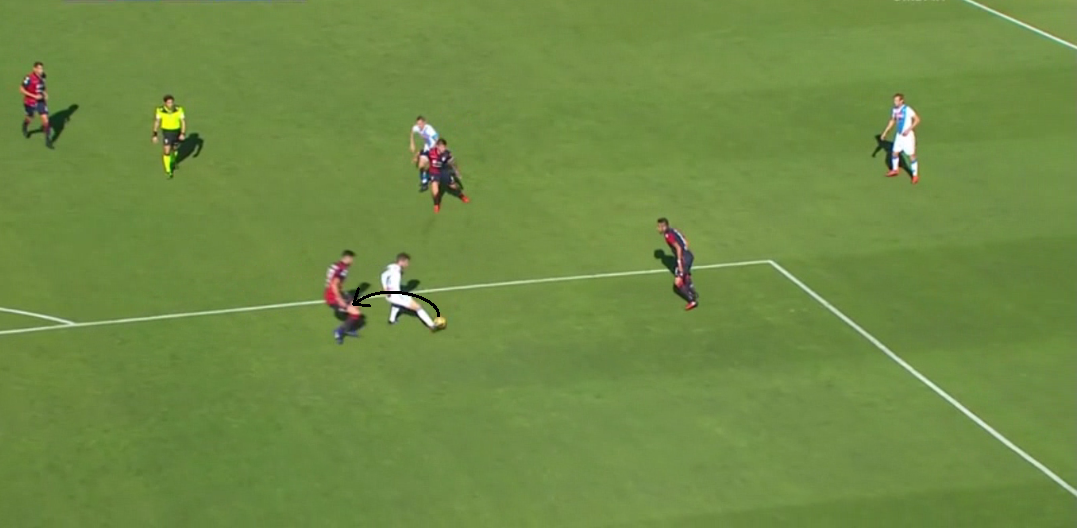 Protagonista indiscusso della sfida al Sant’Elia è Dries Mertens che con una tripletta ha indirizzato in modo deciso la gara. Un aspetto che viene subito all’occhio osservando con attenzione è la capacità del belga nello scegliere sempre la ricezione giusta. Questo gli consente di creare linee di passaggio o di tiro, oltre a sfruttare i corridoi non visibili altrimenti con altre ricezioni: