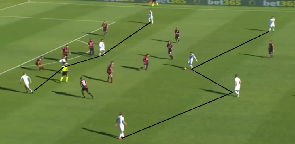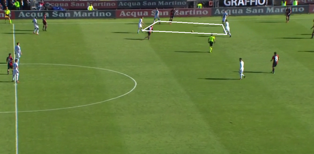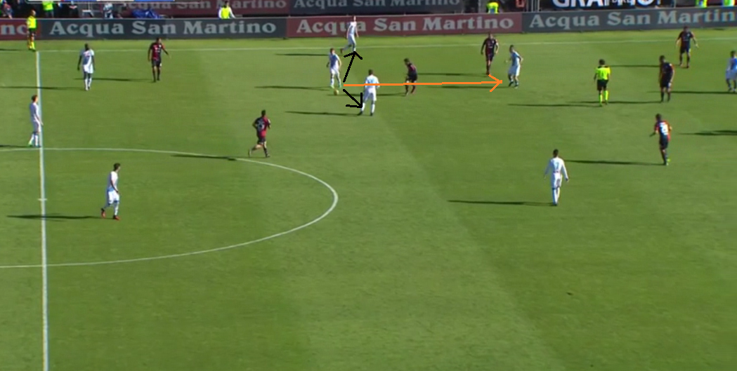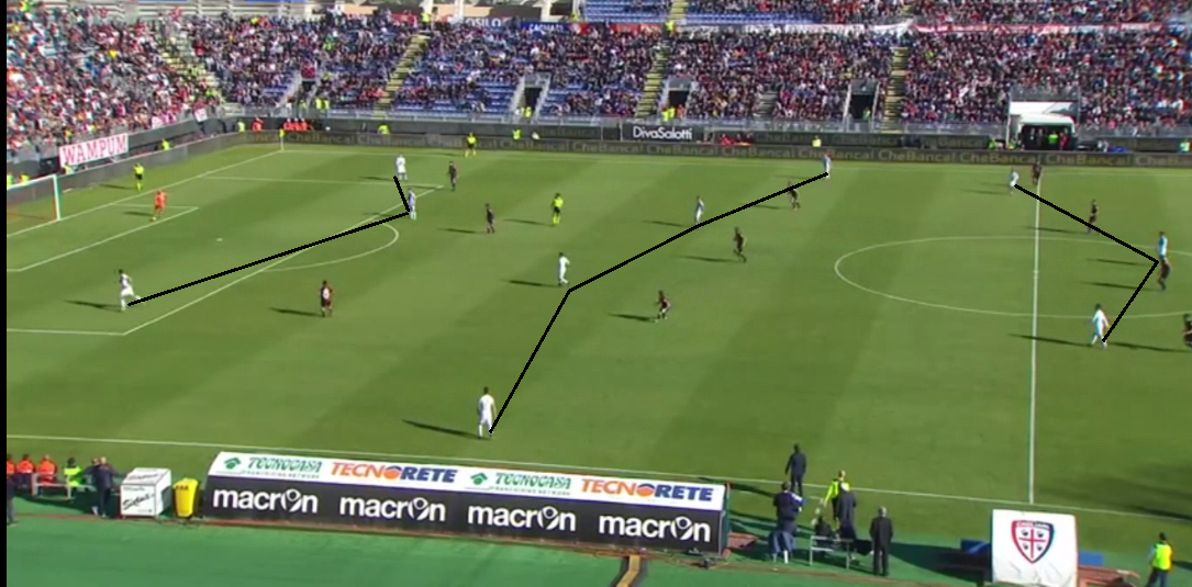 Nonostante il Cagliari provi a chiudere ogni linea di passaggio, gli smarcamenti continui alle spalle del reparto avversario più vicino alla palla consente agli azzurri di creare sempre nuove traiettorie di smistamento palla.