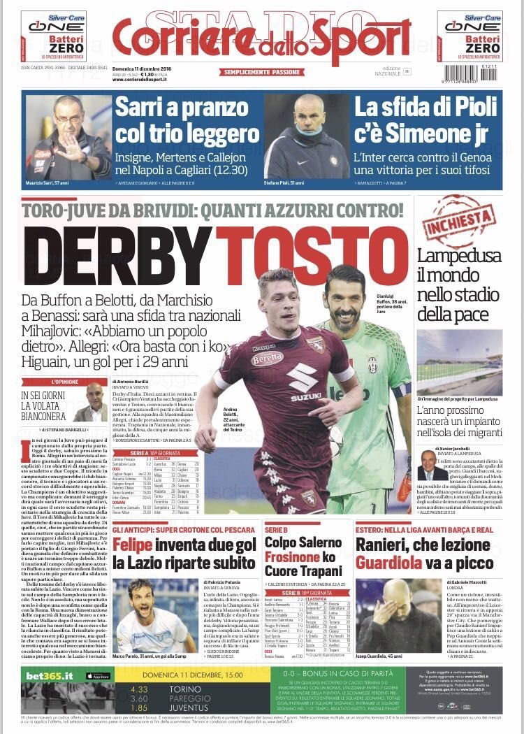 Anche il Corriere dello Sport apre con il derby della Mole: “Derby tosto“, il titolo a centro pagina. In taglio alto spazio al Napoli: “Sarri a pranzo col trio leggero“.
