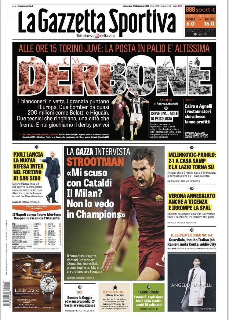 La Gazzetta dello Sport gli dedica il taglio alto e lo chiama “Derbone“: “la posta in palio è altissima“. L’apertura però per l’intervista esclusiva a Kevin Strootman: “Mi scuso con Cataldi. Il Milan? Non lo vedo in Champions“.