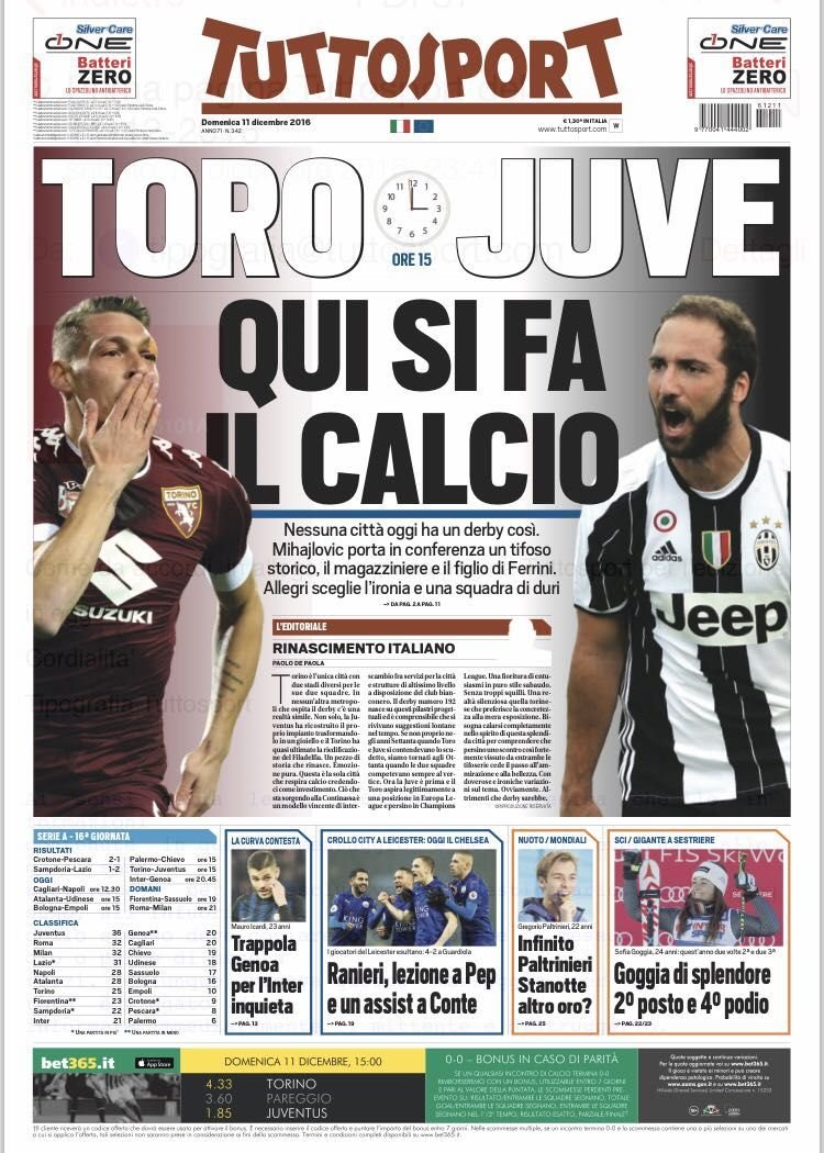 E Tuttosport ovviamente apre con il derby di Torino: “Toro-Juve, qui si fa il calcio” è il titolo in prima pagina del quotidiano torinese che analizza anche le vigilie delle due squadre.