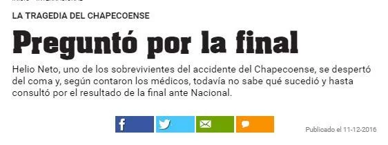 Sebbene il risveglio del trentunenne sia una ottima notizia, per il giocatore si prospetta un periodo psicologicamente duro. Infatti secondo quanto riportato da Olé.com, il difensore avrebbe chiesto il risultato della finale di Copa Sudamericana. Neto infatti non sa che la partita contro l’Atletico Nacional non si è mai giocata a causa dell’incidente aereo.
