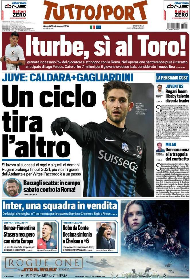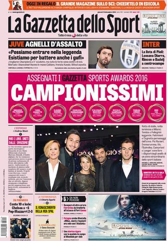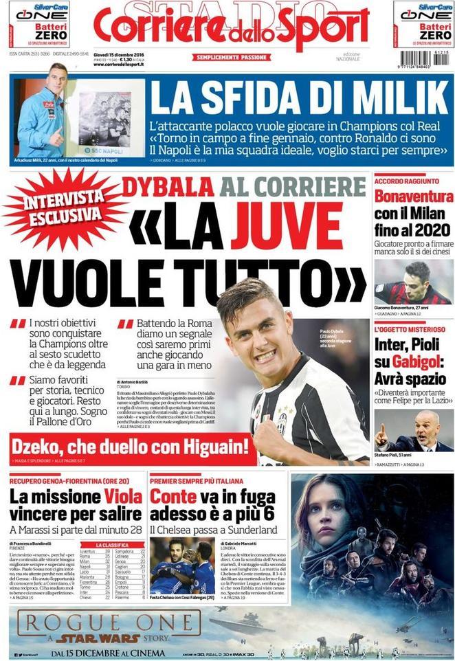 Sono online le prime pagine dei quotidiani sportivi oggi in edicola. Si apre col Corriere dello Sport che dà ampio spazio a Milik, sulla via del recupero, pronto a riprendersi il Napoli e a togliersi qualche soddisfazione in più. Intervista esclusiva a Dybala, poi: il talento della Juve si racconta tra presente e futuro, guardando alla grande sfida in programma contro la Roma. Si passa poi alla Gazzetta dello Sport, con le parole di Andrea Agnelli, i desideri di Stefano Pioli per il mercato dell’Inter e gli award consegnati proprio dalla rosea ieri sera. Si chiude infine con Tuttosport che si focalizza sul prossimo colpo del Toro, Iturbe dalla Roma, e su i botti di mercato della Juventus pronta a prelevare Caldara e Gagliardini dall’Atalanta.