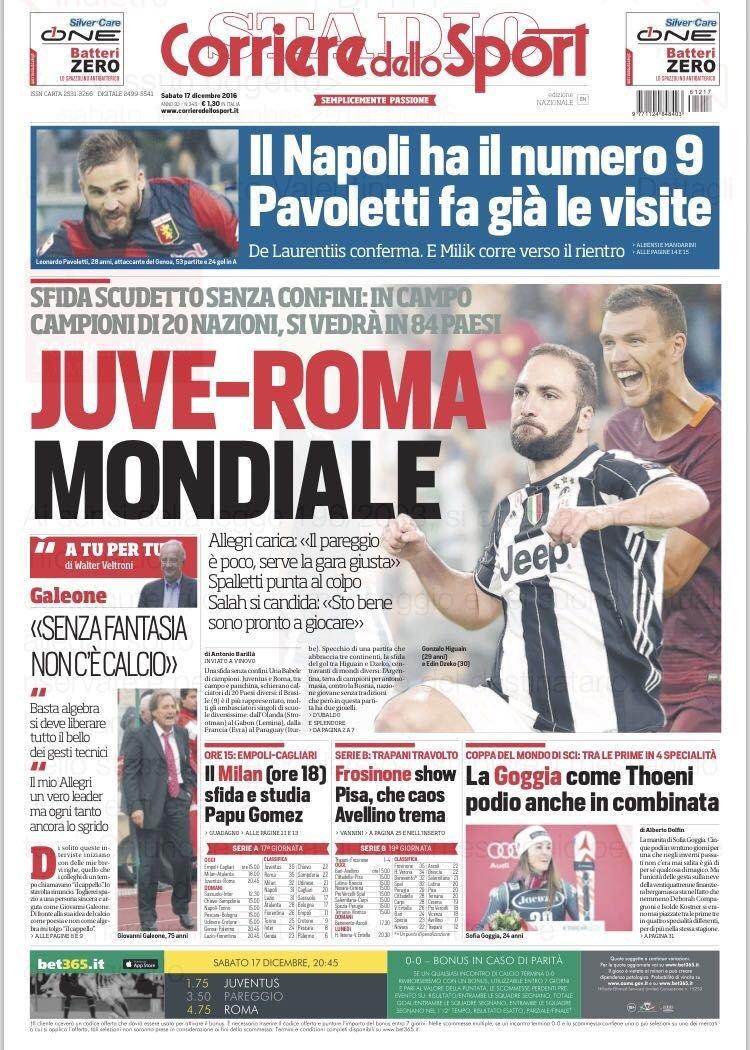 Il Corriere dello Sport anche dedica la propria prima pagina ad una “Juve-Roma mondiale“. In taglio alto il Napoli che “Ha il numero 9, Pavoletti fa già le visite“.