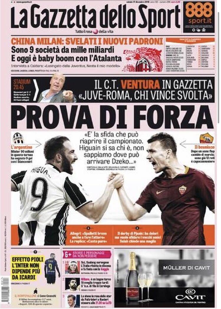 La Gazzetta dello Sport titola in prima pagina con: “Prova di forza“, riferendosi alla partita tra bianconeri e giallorossi.