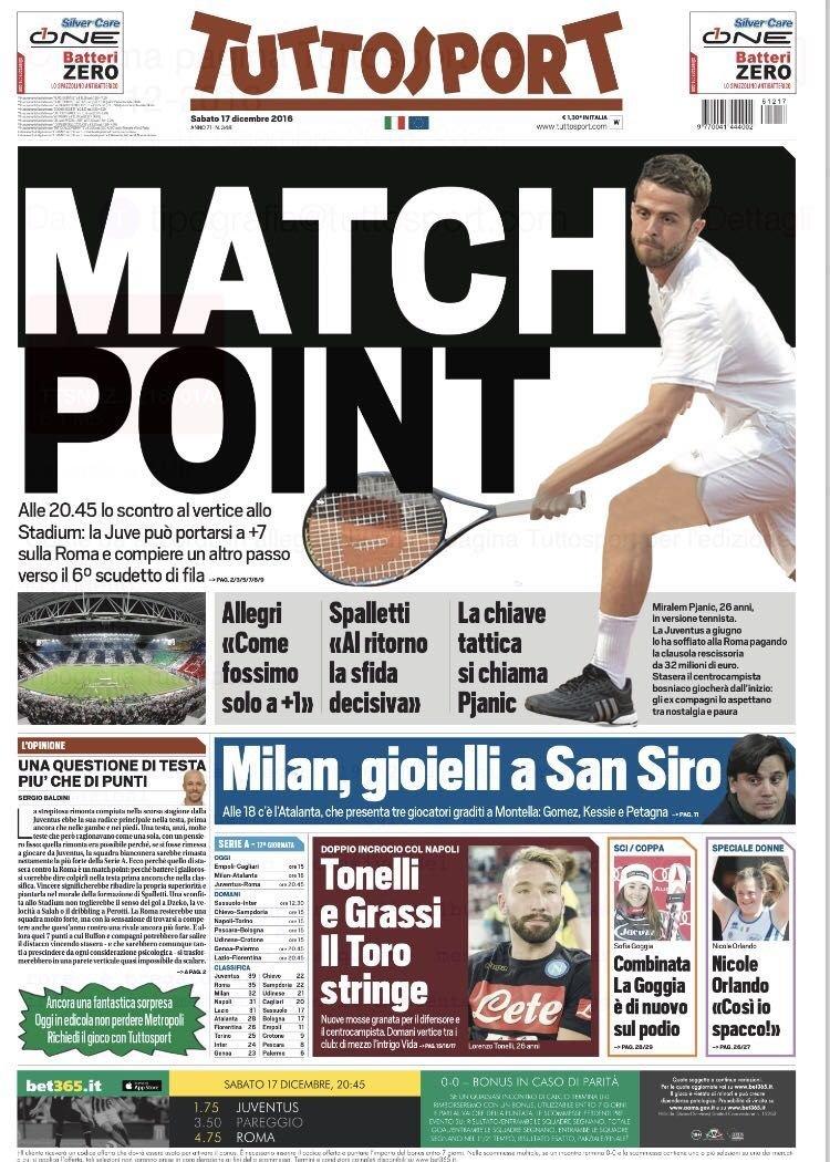 Infine Tuttosport, tornando ancora su Juve-Roma, titola: “Match Point“. In taglio basso, un doppio incrocio Torino-Napoli: “Tonelli e Grassi. Il Toro stringe“.