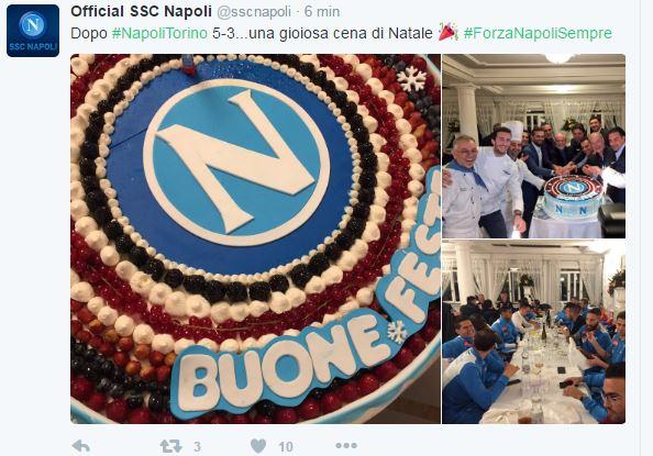 Il Napoli non festeggia solo la Serie A ma anche la qualificazione agli ottavi di finale. Gli azzurri incontreranno il Real Madrid ma oggi si godono la festa. Ecco il messaggio e le foto pubblicate tramite il sito Twitter ufficiale della società : “Dopo #NapoliTorino 5-3…una gioiosa cena di Natale #ForzaNapoliSempre“