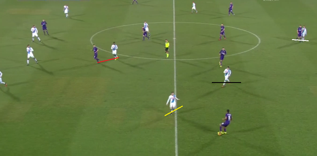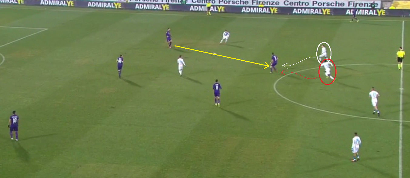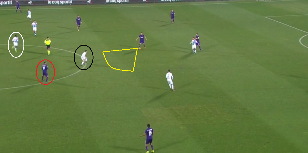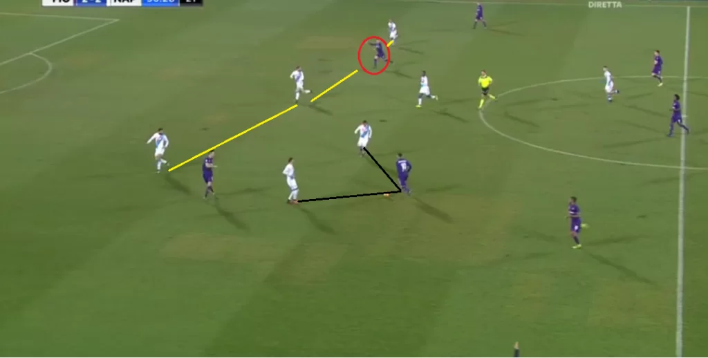 Bravo il Napoli ad annullare ogni linea di passaggio a Olivera: Zielinski (linea gialla) impedisce il passaggio filtrante; Callejon (linea nera) copre il passaggio “appoggiato”; Diawara (linea rossa) e Mertens (linea bianca) marcano a uomo i due vertici intorno all’esterno violaSulla prima ricezione di Astori, Diawara (cerchio rosso) sale in pressione (freccia rossa) sul possibile ricevente, costringendo lo stesso Astori a scorrere palla in orizzontale
