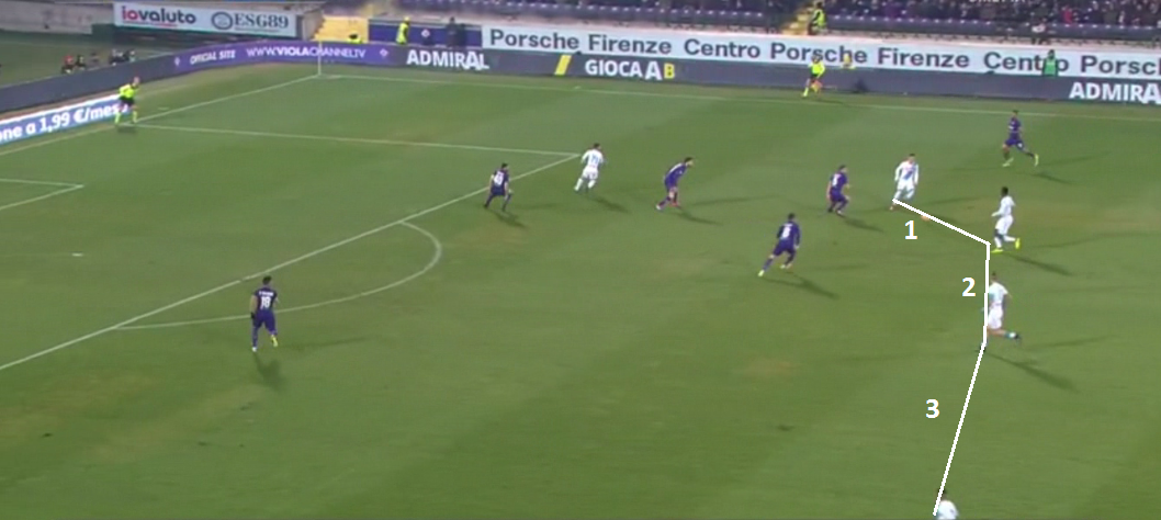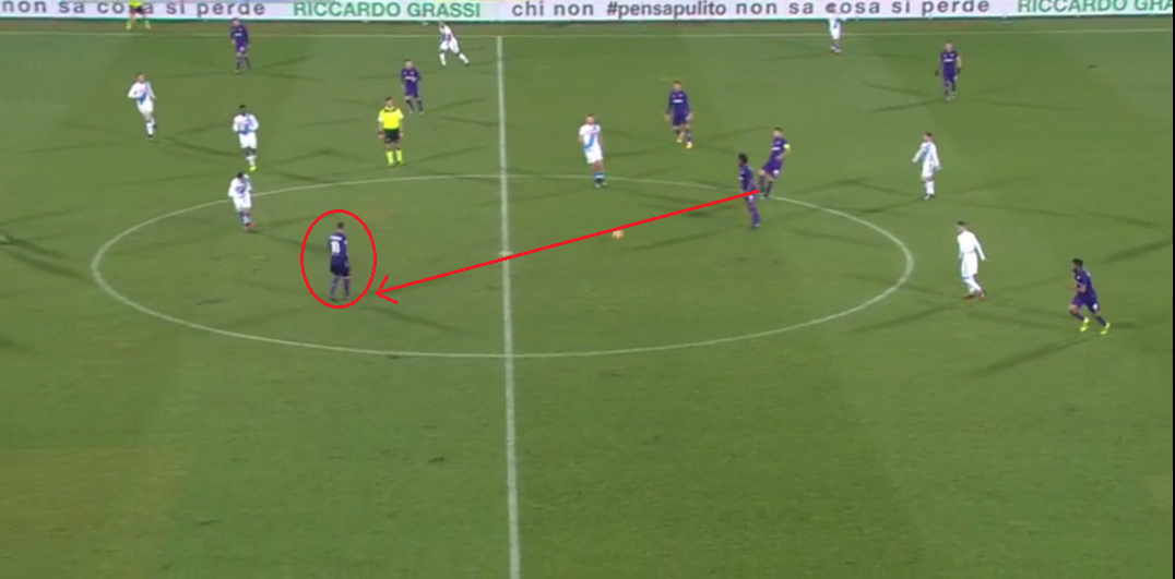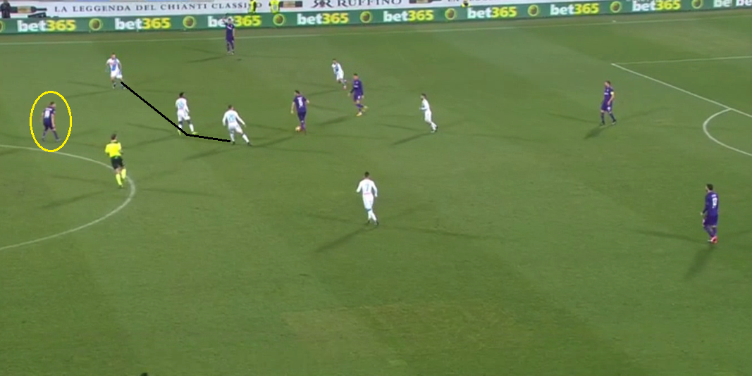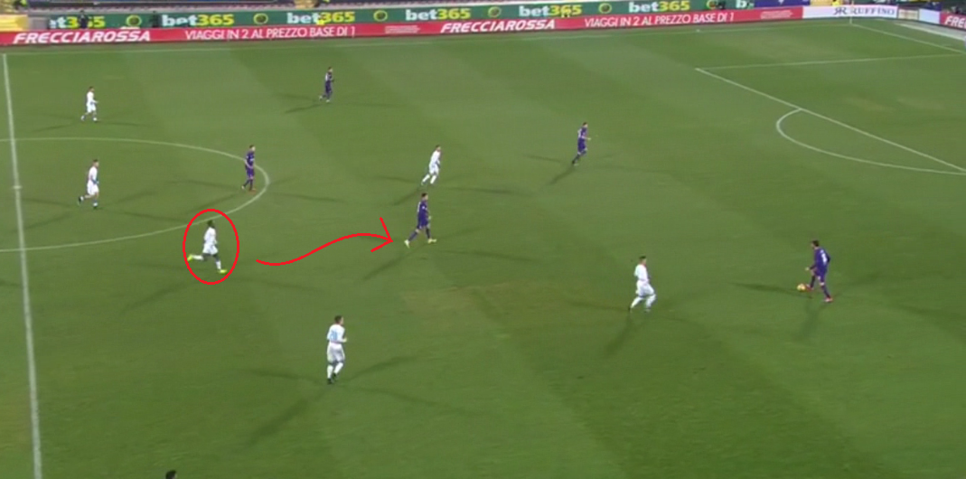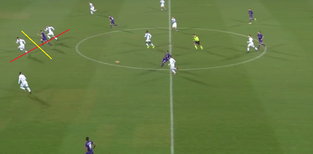 Tutta l’intelligenza tattica individuale di Bernardeschi in un solo movimento. Il numero dieci viola (cerchio rosso) si apre in ampiezza, rivolgendo le spalle alla linea laterale e costringendo Allan ad allontanarsi da Diawara