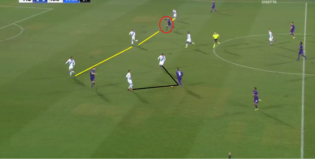 Su palla scoperta giocata da Bernardeschi, errore di Albiol e Maksimovic. I due si dispongono male in diagonale. La linea rossa evidenzia la disposizione errata dei due che, oltre a concedere profondità a Kalinic, non creano un giusto triangolo difensivo. La linea gialla rappresenta, invece, quella che doveva essere la corretta diagonale dei due centrali: triangolo tra Albiol, Maksimovic e Ghoulam