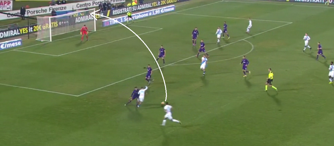 Prodezza di Insigne che sposta rapidamente palla con l’esterno destro verso il centro del campo, prima di far partire il ‘solito’ tiro a giro (freccia bianca)