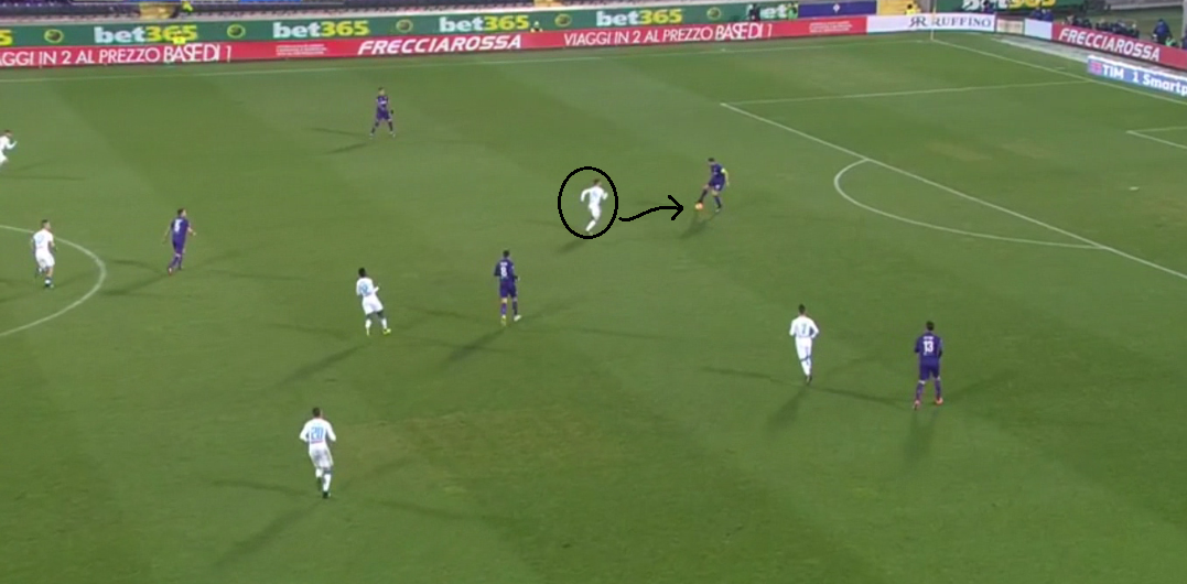 Su scorrimento palla viola (freccia gialla), Diawara (cerchio rosso) e Zielinski (cerchio bianco) salgono in pressing (frecce rossa e bianca). Questo impedisce a Vecino girarsiRubata palla, il Napoli crea subito tre linee di passaggio (linee bianche) per muovere la sfera rapidamente in ampiezza