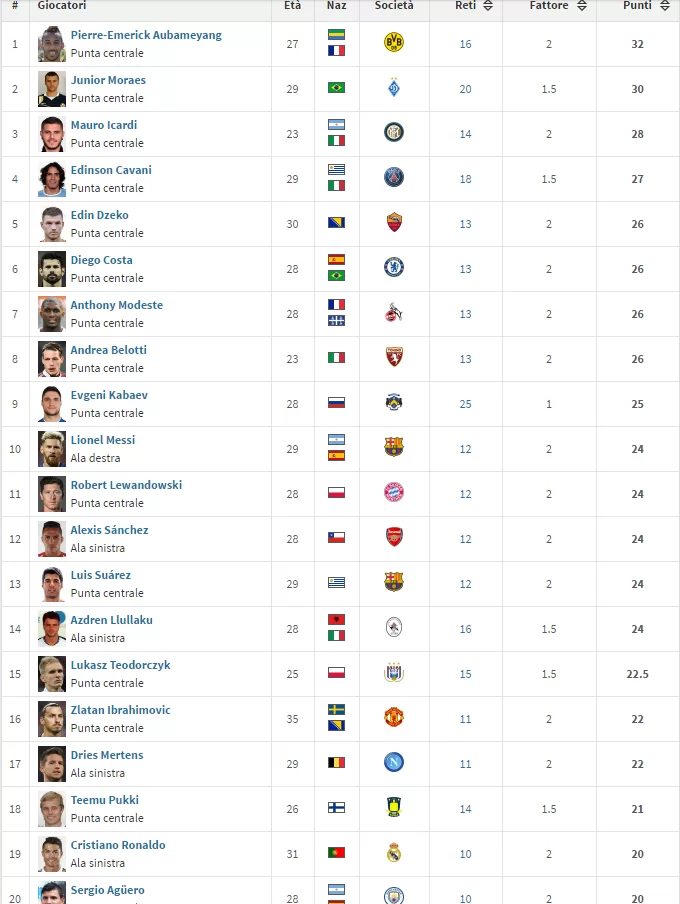Primo Aubameyang con 16 gol (32 punti), mentre l’ex azzurro Cavani è quarto a 18 gol (ma 27 punti per il coefficiente inferiore). Tra i calciatori della Serie A, subito prima di Mertens – quarto nel campionato italiano – ci sono Icardi (terzo con 14 reti) e Dzeko e Belotti (quinti con 13 reti).