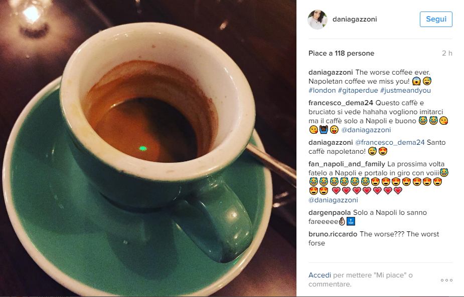 Tra questi, Giaccherini ha deciso di passare diversi giorni a Londra in compagnia della moglie Dania. E proprio la consorte ha pubblicato sul suo profilo Instagram la foto di una tazza di caffè accompagnata dal un particolare messaggio: “Il peggior caffè di sempre. Ci manca quello napoletano! 😱😅”. Le prelibatezze di Napoli fanno sempre sentire la propria mancanza…
