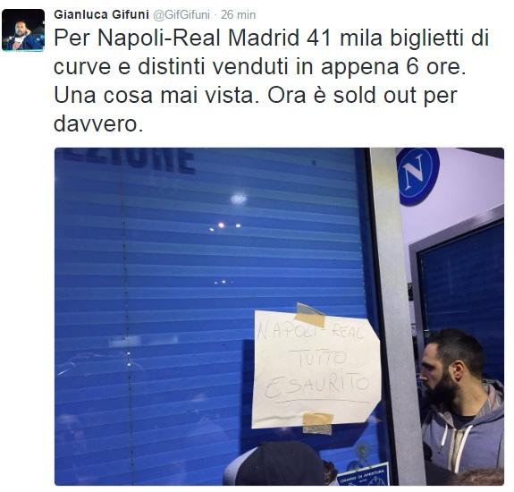 “Per Napoli-Real Madrid 41mila biglietti di Curve e Distinti venduti in appena sei ore. Una cosa mai vista. Ora è sold out per davvero” ha commentato il giornalista.