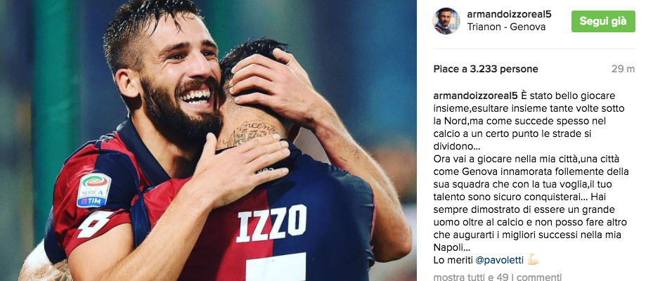Ora è ufficiale, Leonardo Pavoletti è un calciatore del Napoli. E il suo ex compagno di squadra al Genoa, il napoletano Armando Izzo, gli ha dedicato un messaggio stupendo su Instagram.
