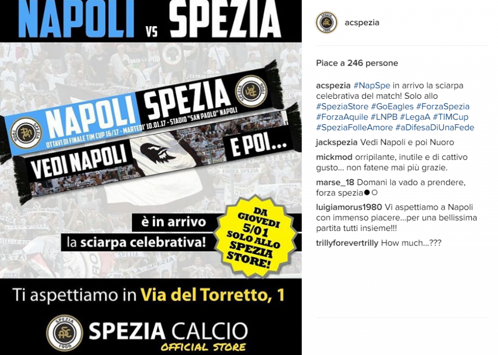 Gli ottavi di Coppa Italia stanno per arrivare, con il Napoli che è pronto ad ospitare i liguri dello Spezia. Proprio nella città portuale l’attesa è molto grande, con i cadetti che sanno di dovere affrontare una grande squadra. Una bella festa di sport insomma, come testimoniato dallo stesso club. La società bianconera ha voluto, infatti, omaggiare l’impegno con una sciarpa celebrativa.