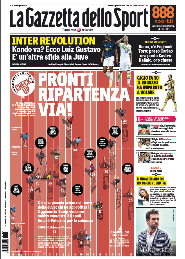 Archiviate le feste, si riaprono le danze in Serie A. Il campionato riserva già un’insidia per il Napoli, secondo Tuttosport. “Giampaolo cerca l’impresa al San Paolo” scrive il quotidiano torinese in taglio basso. Le prime pagine, comunque, sono interamente o quasi dedicate alla Juventus. “Chi la ferma?” scrive il Corriere dello Sport. “Risiko Juve” continua Tuttosport in ottica mercato.