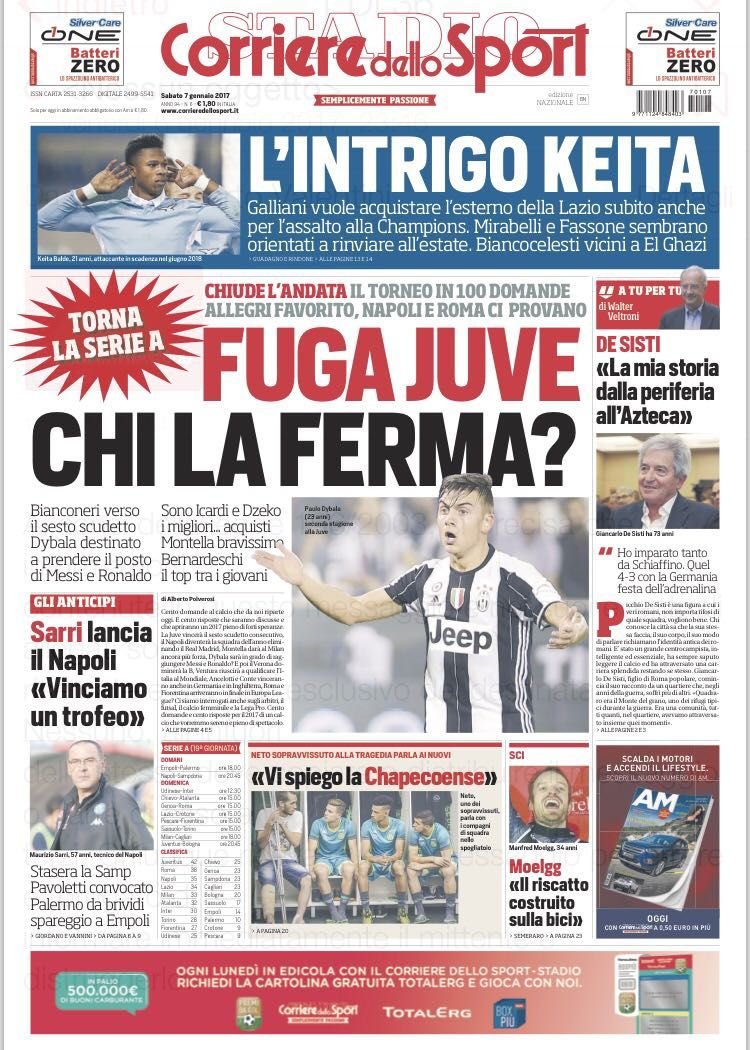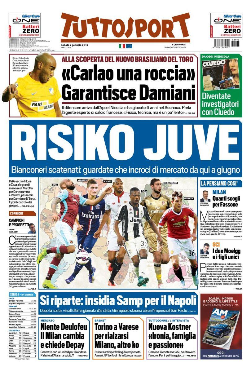 Archiviate le feste, si riaprono le danze in Serie A. Il campionato riserva già un’insidia per il Napoli, secondo Tuttosport. “Giampaolo cerca l’impresa al San Paolo” scrive il quotidiano torinese in taglio basso. Le prime pagine, comunque, sono interamente o quasi dedicate alla Juventus. “Chi la ferma?” scrive il Corriere dello Sport. “Risiko Juve” continua Tuttosport in ottica mercato.