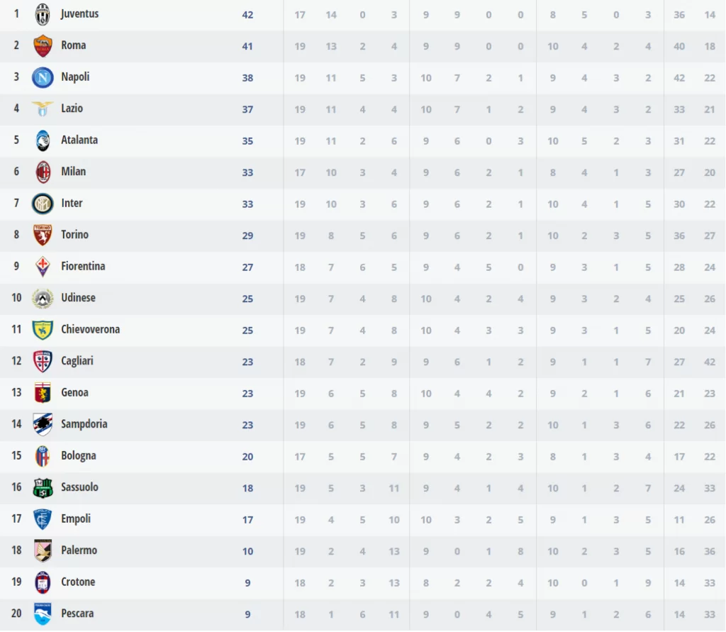 AGGIORNAMENTO 22.38 – La Juventus ha battuto il Bologna 3-0 nel posticipo dell’ultima giornata di andata. Una doppietta di Higuain e un gol di Dybala hanno regalato la vittoria ai bianconeri. Nel pomeriggio il Milan ha avuto la meglio sul Cagliari grazie a un gol di Bacca nel finale di gara. Questa la classifica aggiornata: