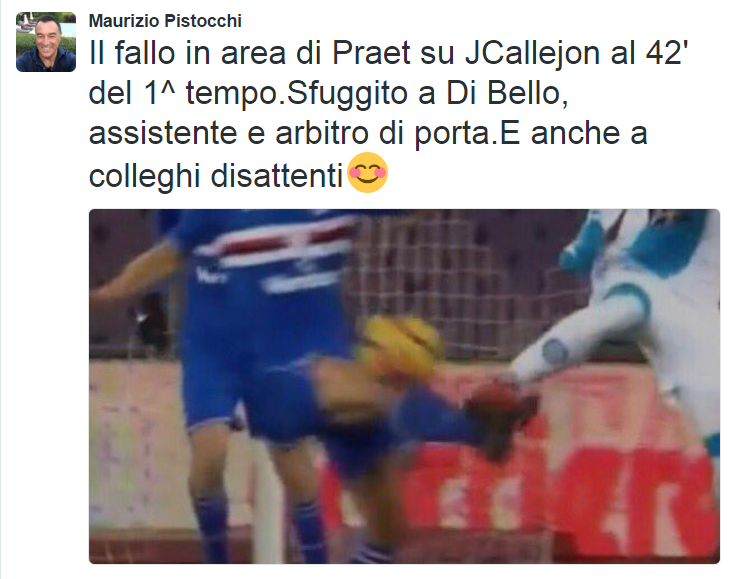 “Il fallo in area di Praet su Callejon al 42′ del primo tempo. Sfuggito a Di Bello, assistente e arbitro di porta. E anche a colleghi disattenti”, ha scritto su Twitter, allegando l’immagine incriminata.