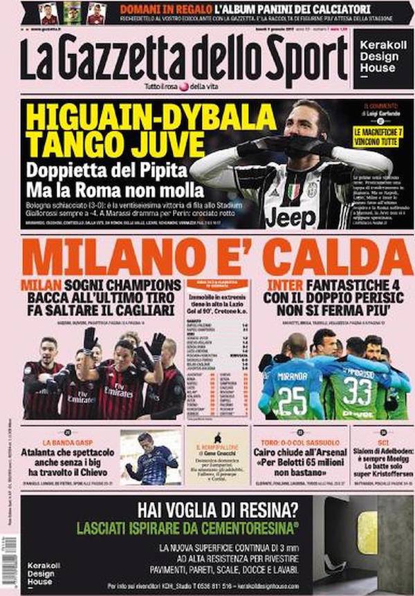 La Gazzetta dello Sport invece dedica i titoli principali alle due milanesi. “Milano è calda” a indicare una vittoria all’ultimo respiro per il Milan contro il Cagliari. L’Inter invece trionfa nella difficile trasferta di Udine e gli elogi sono tutti per Ivan Perisic: “Con il doppio Perisic non si ferma più“.